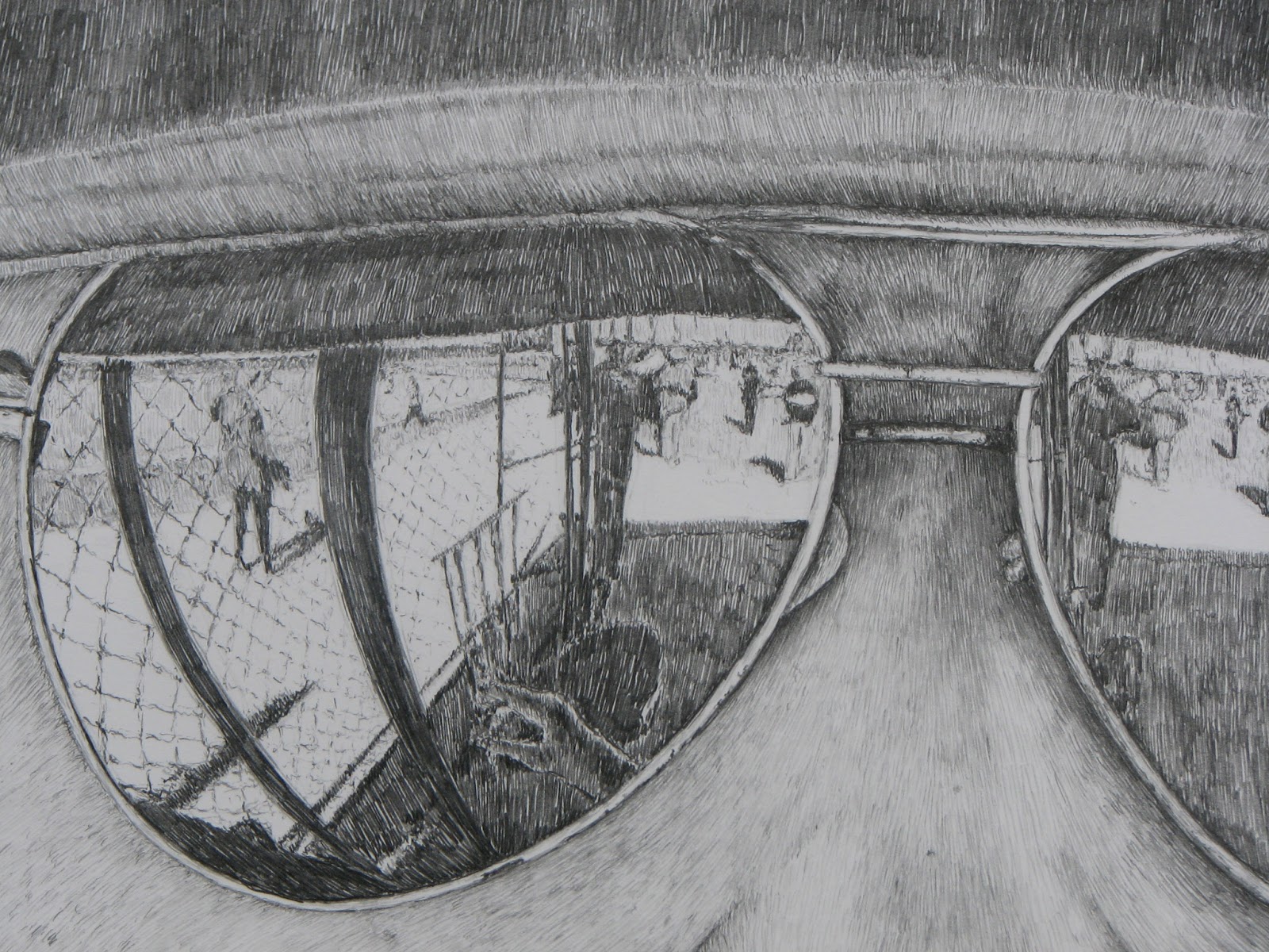 Detail of reflection in sunglasses on a pencil drawing by John Huisman, Ely Mn |