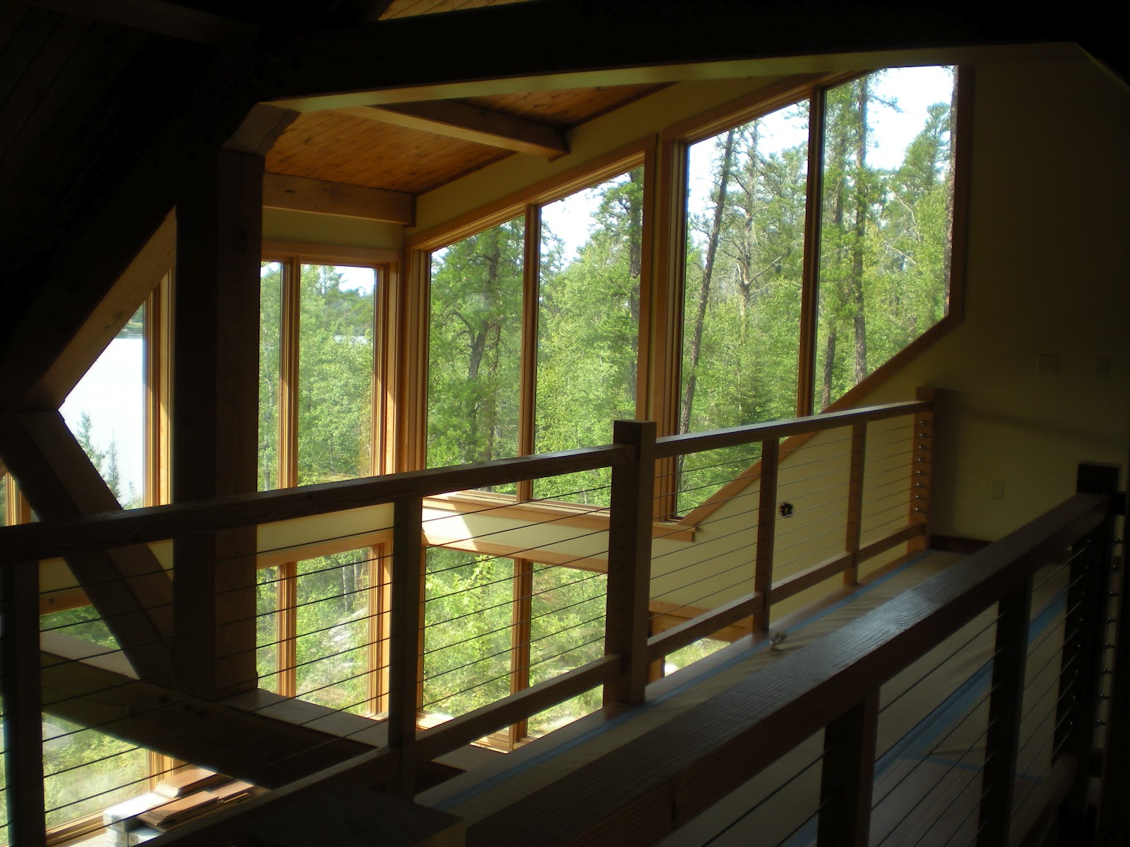 coming up the stairs and looking out over the loft through the lakeside windows through the fir timbers and cable railing. |