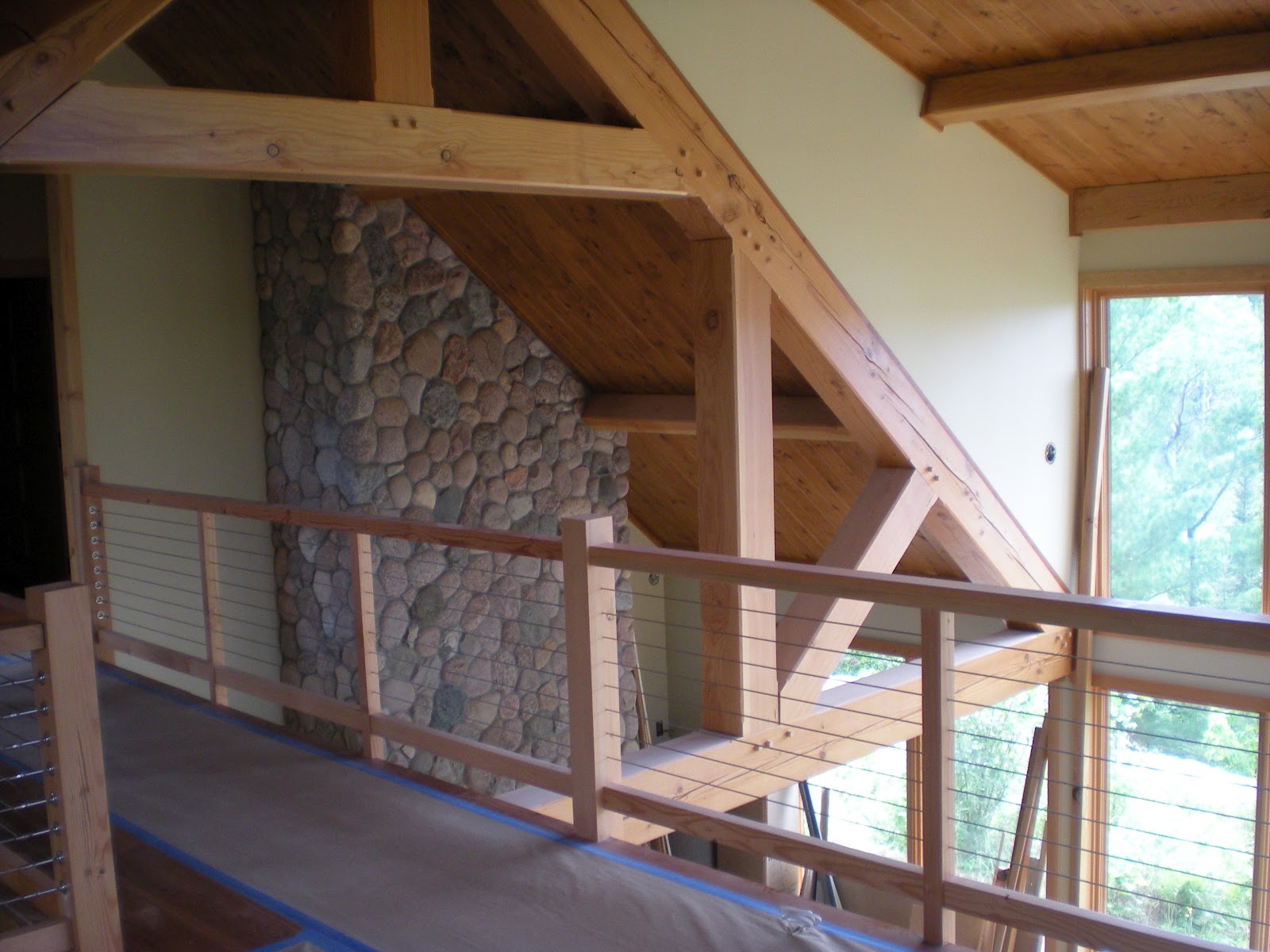 Looking over at the stone chimney over the fireplace, Douglas Fir Timbers and stainless steel cable railing… |