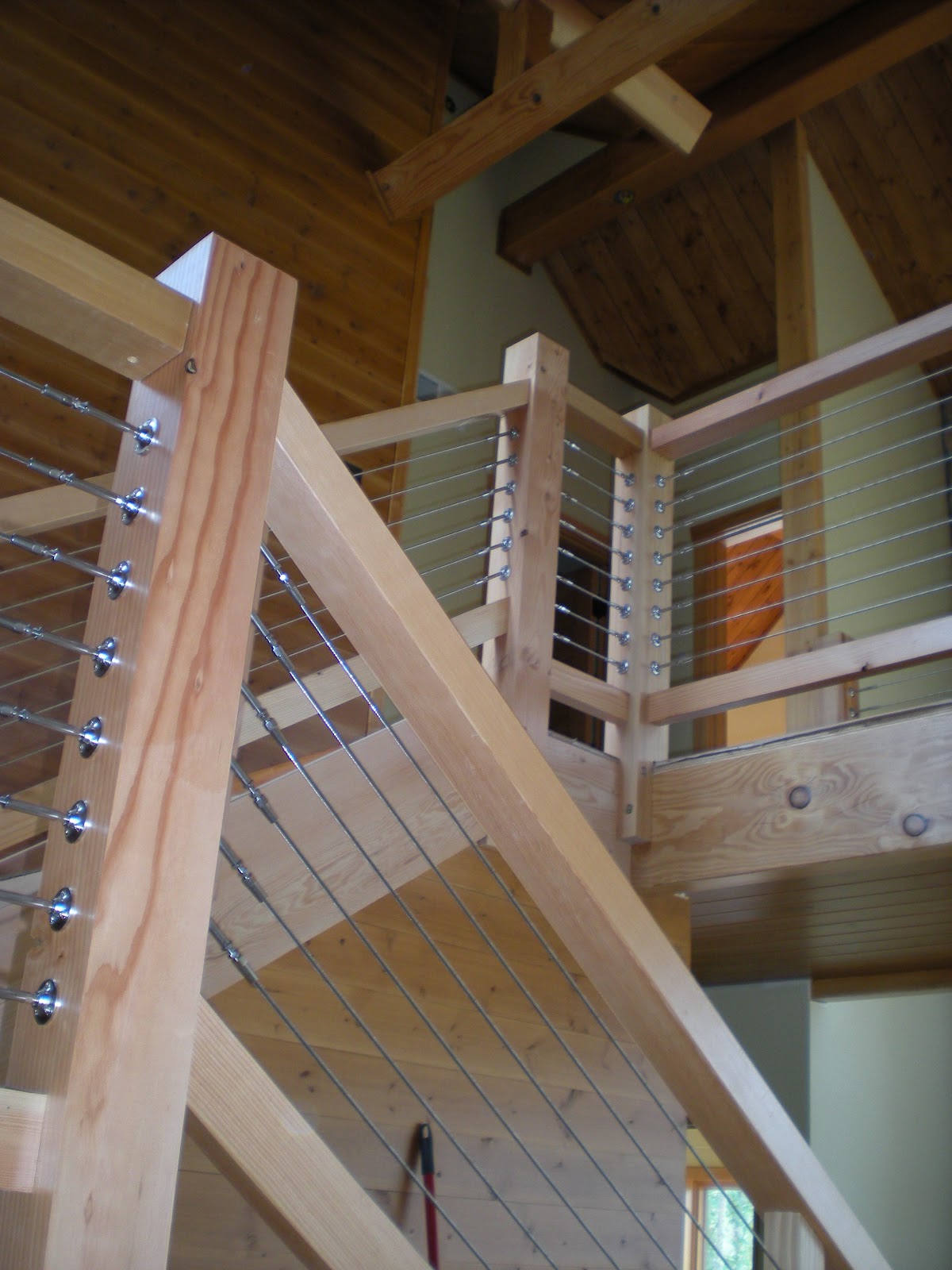 Looking up the stairs from the main floor through the Douglas Fir and cable railing |