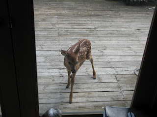 Last weekend something interesting happened here at home. I was heading out to the shop and my son, Jonathan, comes in from his jog. He had come up the trail through the woods and, behind him, this spotted fawn: