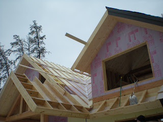 Back to the roof now that the fascia has come in. The fascia is a dark brown pre-finished OSB product called LP Smartside. Here are some pictures showing the fascia going on and parts of the roof sheeted and the soffets and venting being finished.