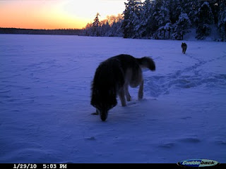 A neighbor with a trail cam caught these images of some wolves out on the lake a few nights ago.
