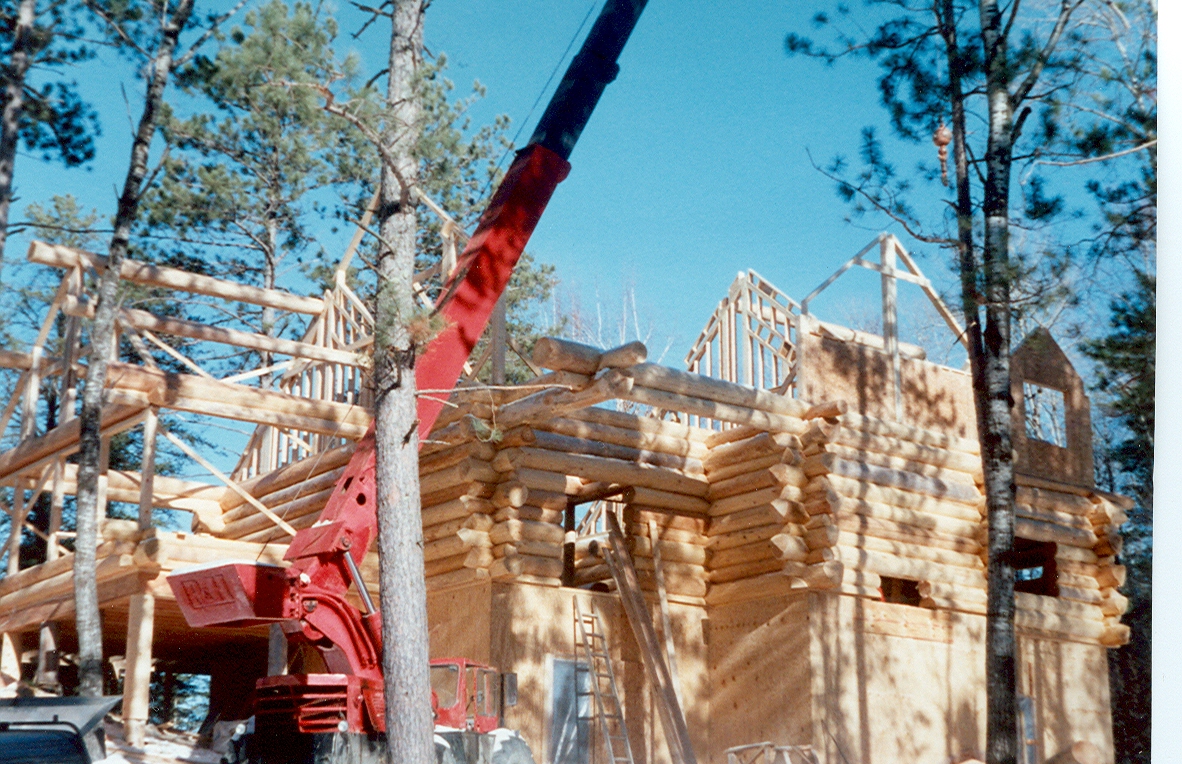 We did the log-work on site with this one, unlike many of the other log homes we have built over the years where we carve, fit and assemble the logs off site and then take them apart and reassemble on site.