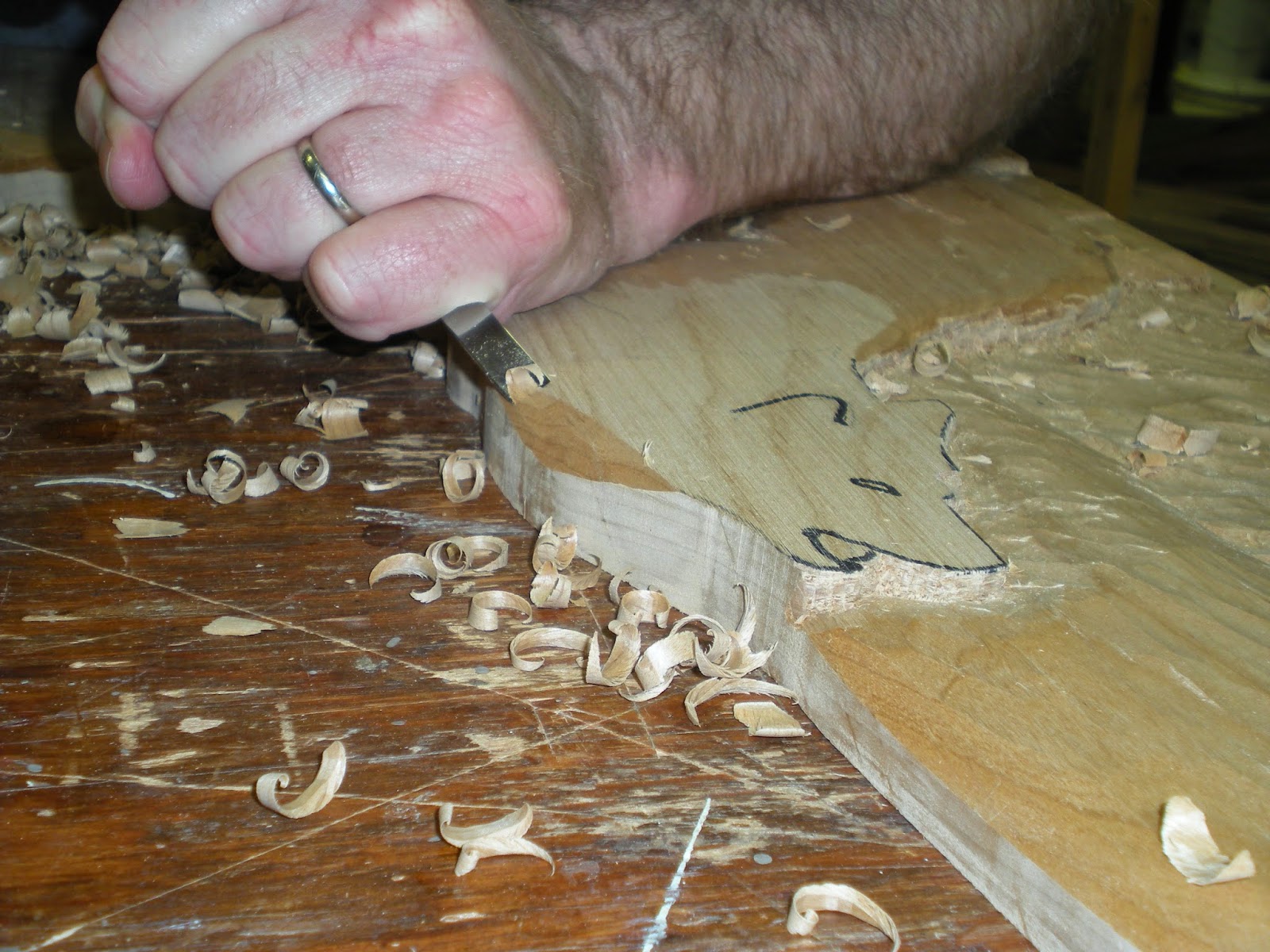 This is a picture of the carving in progress. This carved image of the wolf howling needed to be mirrored so the door would look the same from both the inside and outside. |
